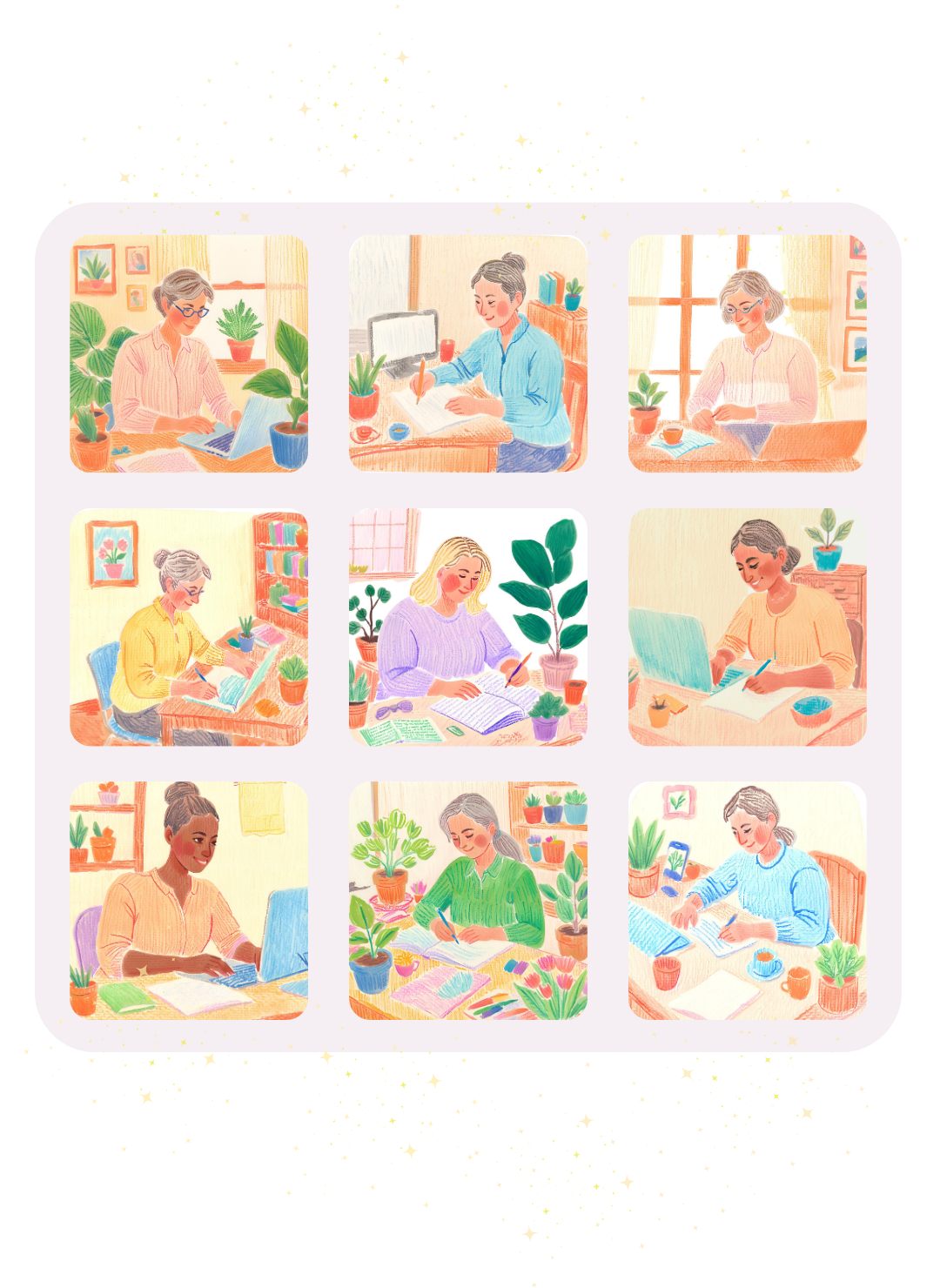 We work via Zoom, alongside each other, gently metabolizing group energy for our deep, focused solo work.